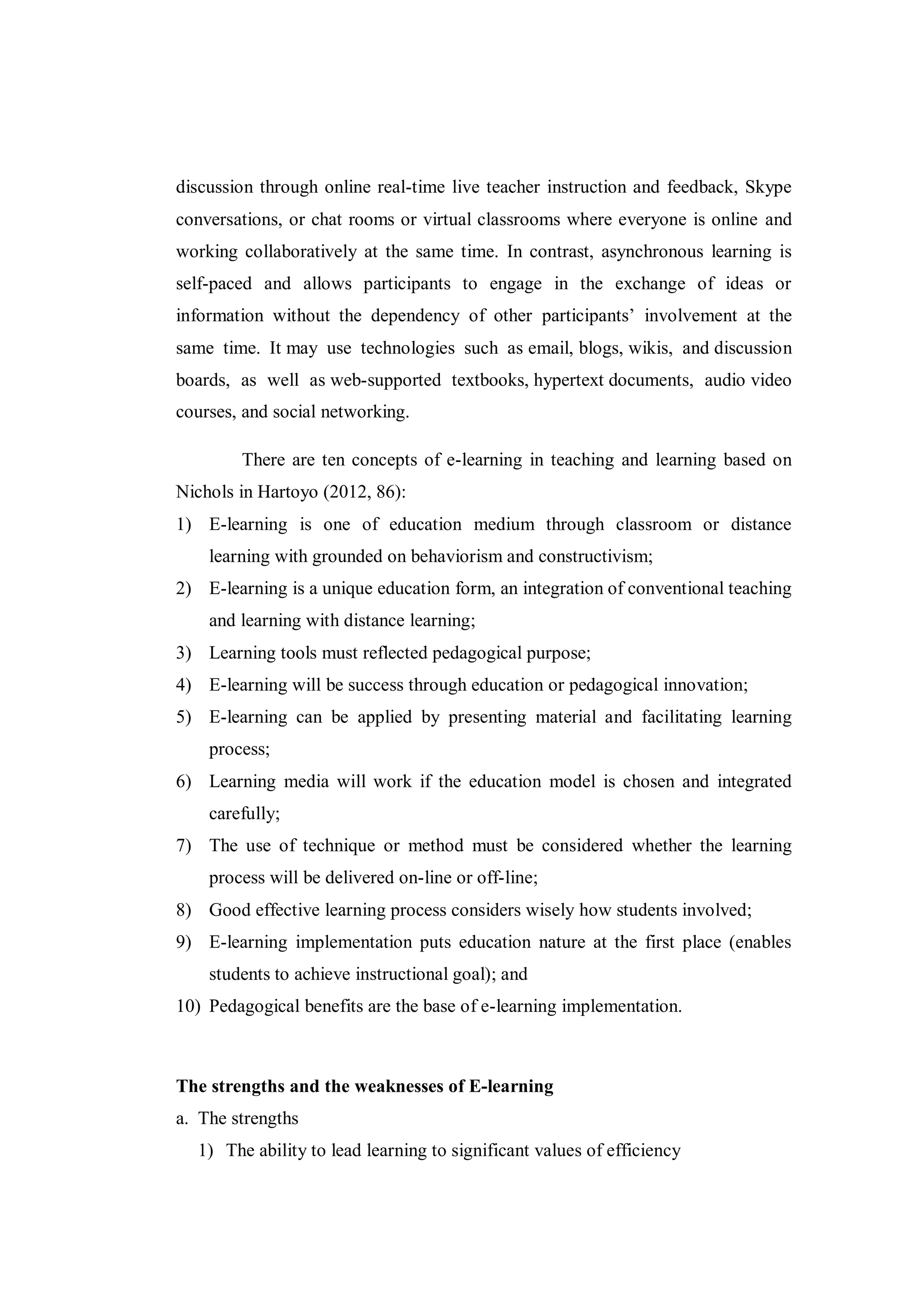 This document discusses e-learning and its concepts, strengths, weaknesses, advantages, and disadvantages. It begins by explaining how technology and computer/internet usage has impacted education. E-learning refers to using electronic media and information technologies for education. It can be synchronous, with real-time instruction, or asynchronous, with self-paced learning using technologies like email and discussion boards. The document then lists 10 concepts of e-learning and discusses its strengths like efficiency and flexibility. Weaknesses include limited funding, lack of technical skills, and low internet connections. Advantages are convenience, effective learning, and improved quality, while disadvantages are lack of social interaction and ease of cheating.