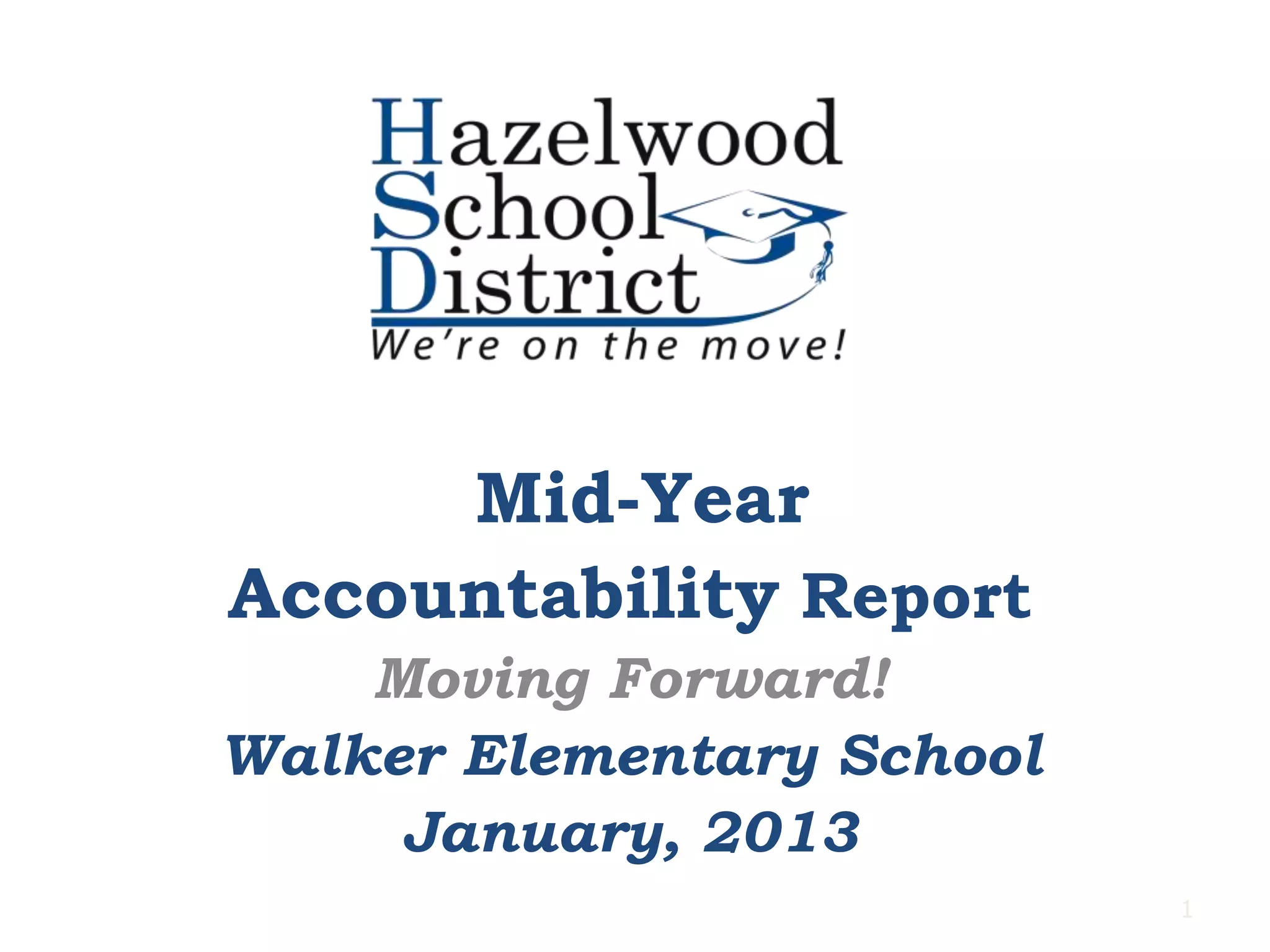 This mid-year accountability report from Walker Elementary School summarizes their progress in English Language Arts. It shows their 5-year ELA trend data, with a current proficiency rate of 58% for 3rd grade, 46% for 4th grade, and 50% for 5th grade. To improve student achievement, the teachers have implemented strategies like higher-level questioning, student-friendly learning targets, and self-assessment. Currently, 24% of students are below grade level based on reading levels. For the second semester, the school plans to increase assessment literacy strategies, focus on high-level questioning, and provide more rigorous instructional activities.