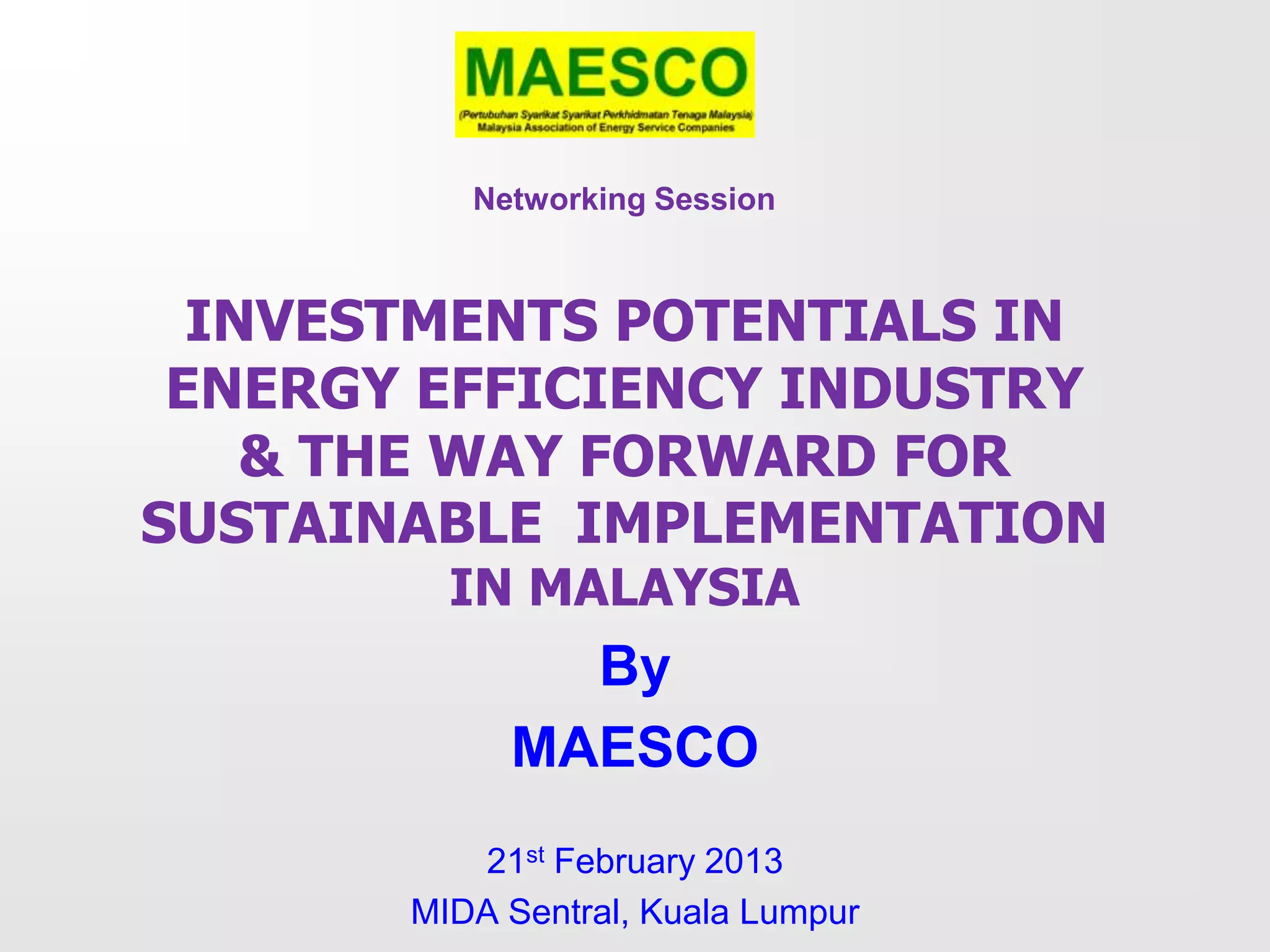 The document discusses a networking session focused on the potentials of energy efficiency (EE) in Malaysia, organized by Maesco. It highlights the role of Energy Service Companies (ESCOs) in implementing EE projects, identifies barriers to EE implementation, and proposes measures for sustainable development in the sector. Additionally, it emphasizes the need for a national EE policy, a centralized agency, and funding mechanisms to overcome existing challenges and promote energy efficiency across various sectors.