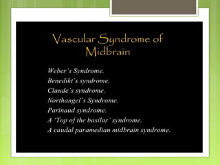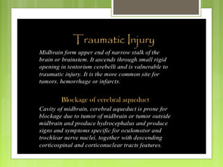 The document provides an overview of the anatomy and structures of the midbrain. It notes that the midbrain connects the pons and cerebellum to the forebrain, is about 0.8 inches long, and is traversed by the cerebral aqueduct filled with CSF. Key structures discussed include the crus cerebri, oculomotor nerve, superior and inferior colliculi, brachium, and trochlear nerve. The midbrain is divided into cerebral peduncles, tectum, and tegmentum. Transverse sections show structures like the substantia nigra, red nucleus, and tracts. Blood supply comes from the posterior cerebral, superior cerebellar, and basilar arteries.