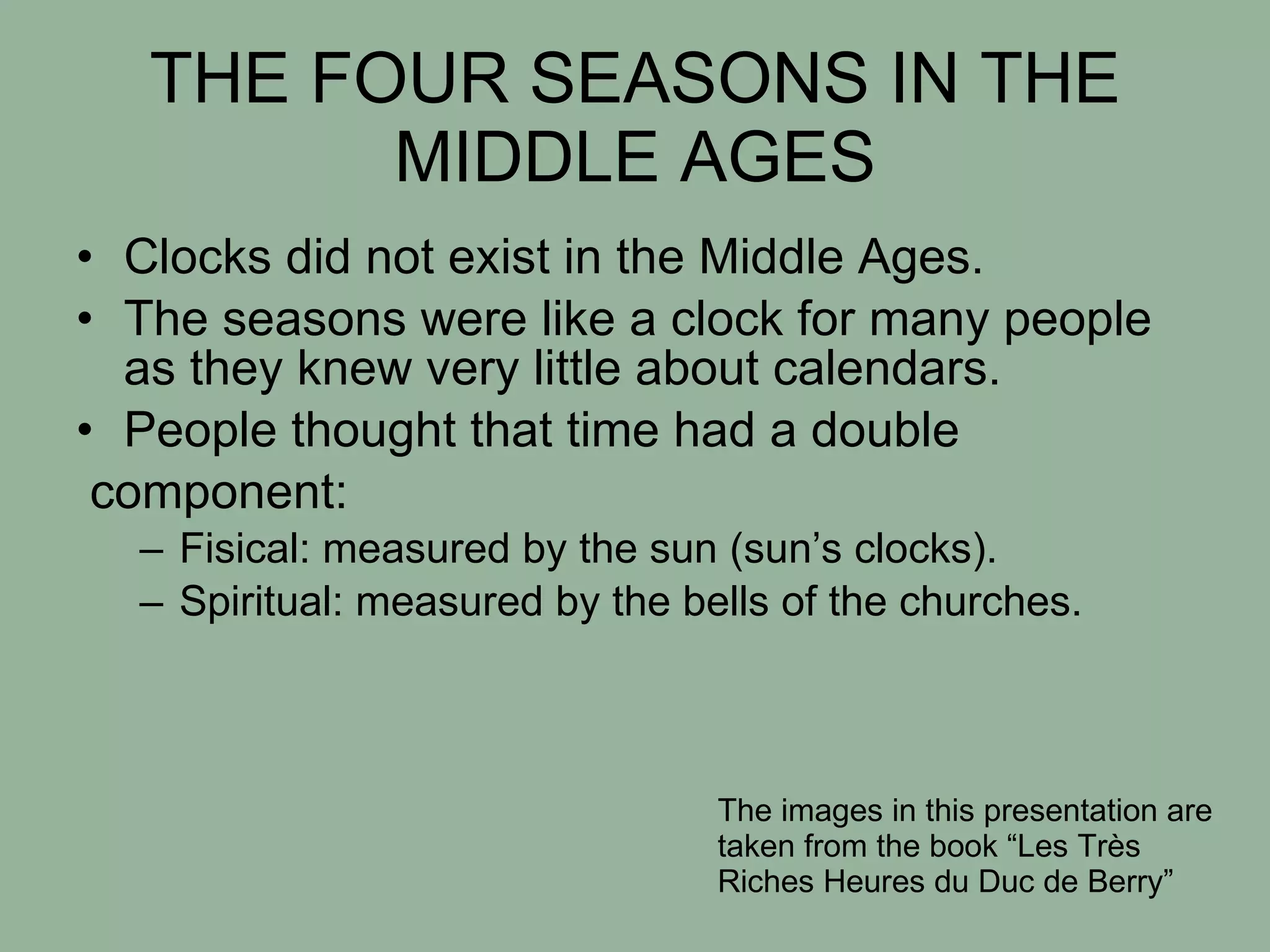 The document summarizes the four seasons in the Middle Ages from the perspective of medieval Europeans based on images from the book "Les Très Riches Heures du Duc de Berry". Each season is associated with religious holidays and agricultural activities. Winter marked Christmas and purification rituals. Spring symbolized resurrection around Easter and the resumption of farming. Summer contained the longest day in June and harvest celebrations in August. Autumn was a time for accounting, harvests, and remembering the dead in November.