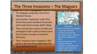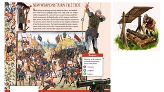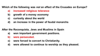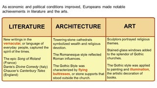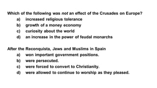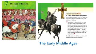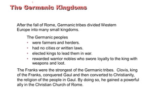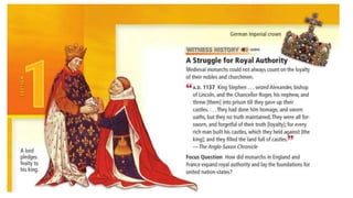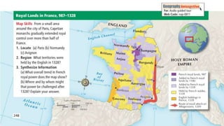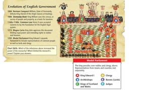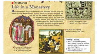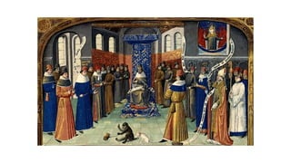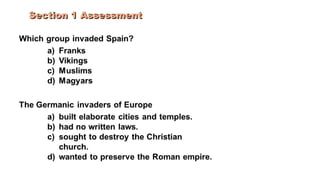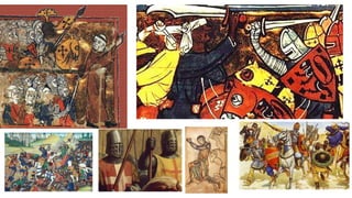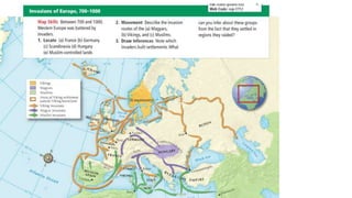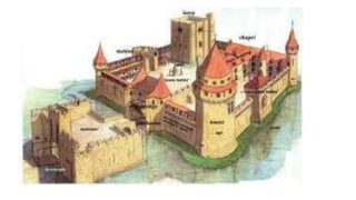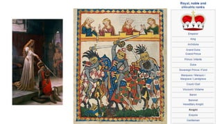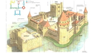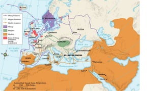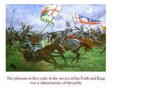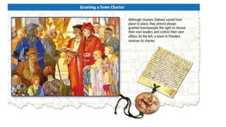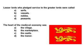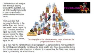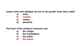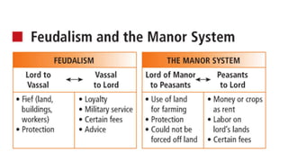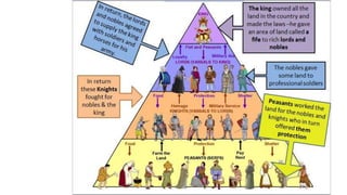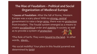 Feudalism developed in medieval Europe as a political and economic system in response to invasions and weak kings. It involved the division of land among lords in a hierarchy, with lesser lords pledging loyalty and service to greater lords in exchange for protection. Peasants worked the land of the lords in exchange for protection and a small plot to farm. Serfs were bound to the land and made up most of the population.