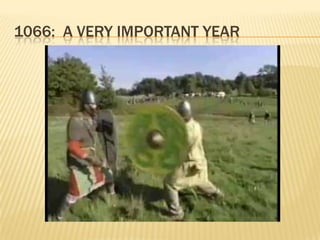 The Middle Ages saw major changes in England beginning in 1066 with the Norman conquest. William the Conqueror, Duke of Normandy, invaded England and defeated King Harold II at the Battle of Hastings, establishing Norman rule. William implemented a feudal system dividing lands among his nobles, bringing Norman-French culture and administrative reforms. Feudalism established a strict social hierarchy from king to serfs. The rise of chivalry and courtly love influenced knights' behavior. Major events like the Crusades, Black Death plague, and Thomas Becket's martyrdom impacted society. Geoffrey Chaucer's Canterbury Tales, written in the late 14th century, provides insight into life at the end of the Middle