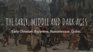 The document provides an overview of architecture from the Early Christian period through the Gothic era. It begins by discussing how the Roman Empire split into eastern and western halves in 400 CE. Christianity had become the dominant religion. As new rulers came to power, architectural styles evolved from Early Christian to Byzantine under Constantine, and then to Romanesque. Key events and developments discussed include Constantine moving the capital to Constantinople in 330 CE and constructing Hagia Sophia, the fall of the Western Roman Empire in 410 CE, and the emergence of Gothic architecture in the late medieval period. Stylistic elements of Early Christian, Byzantine, and Romanesque architecture like semicircular arches, vaulting techniques, and basilica