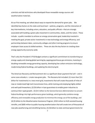 The document discusses green jobs and training programs to support the growth of green jobs. It provides examples of successful green jobs training programs, including those run by Red Rocks Community College in Colorado and SEIU 32BJ in New York City. It also outlines partnerships between the Departments of Labor, Housing and Urban Development, Energy, and Education to connect workers with green job opportunities and training using Recovery Act funds. The task force aims to ensure the middle class benefits from and is strengthened by the growing clean energy economy.
