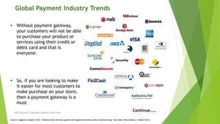 The document discusses payment gateway options for businesses in the United Arab Emirates. It provides an overview of the global payment industry trends of high growth. In the UAE, integrating local payment gateways requires businesses to be legitimate and pay setup and transaction fees. The document analyzes several payment gateway providers that are suitable options for the UAE market, comparing their transaction costs, fees, and currency acceptance. It concludes that 2Checkout may be the best initial option for new companies due to its lack of setup fees.