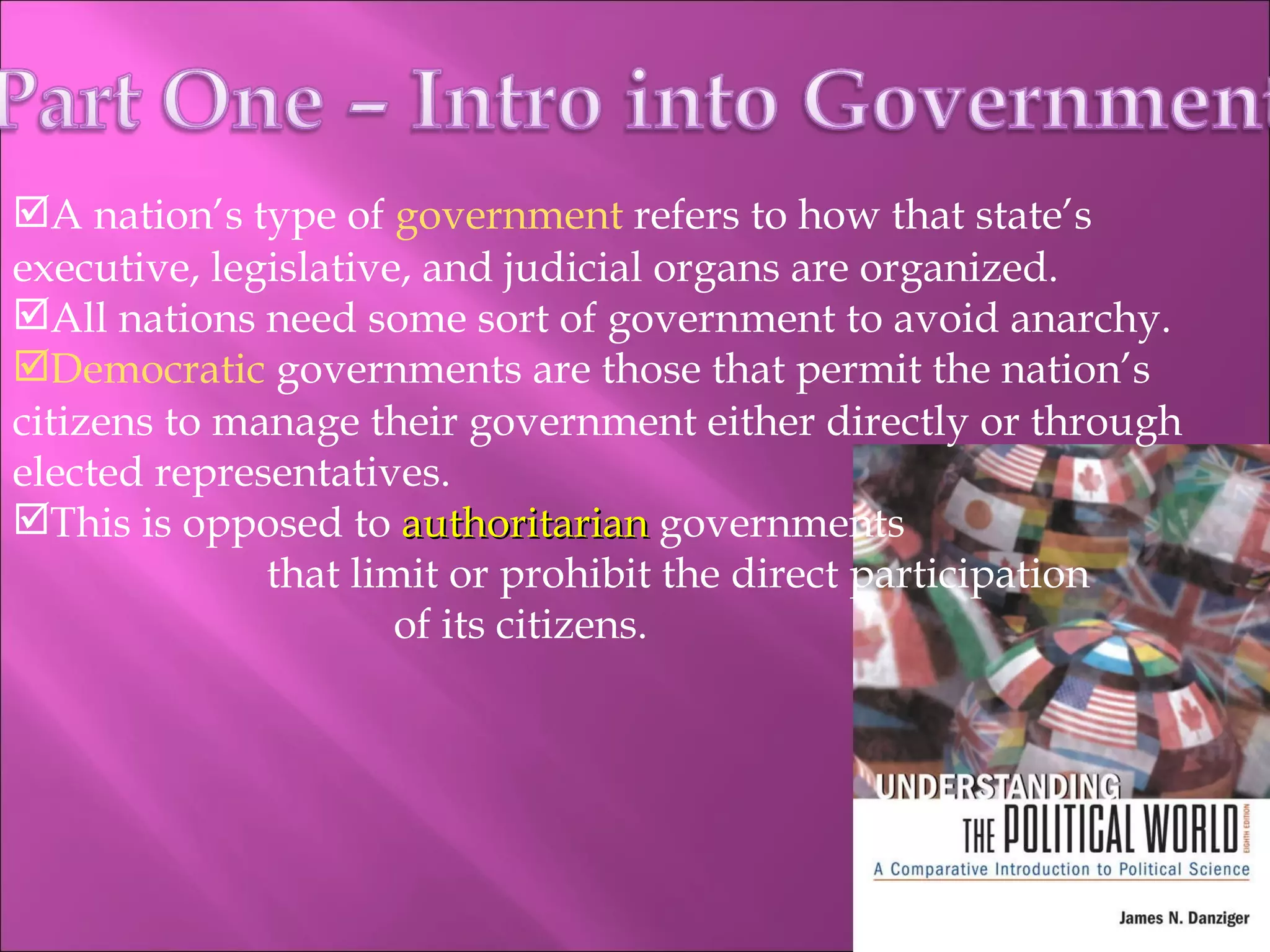 - Democratic governments give citizens a role in government through voting and representation. Israel and Iraq are examples.
