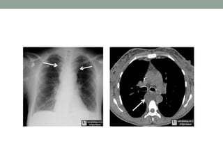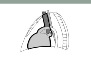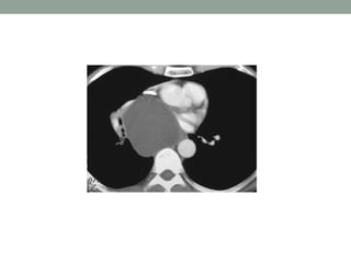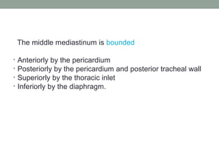 The middle mediastinum contains structures like the heart, great vessels, trachea and lymph nodes. Common masses include lymphadenopathy, bronchogenic cysts, duplication cysts and aneurysms. Aortic aneurysms appear as round masses that may erode bone or involve nerves. Bronchogenic cysts are usually round and contain fluid. Duplication cysts may contain gastric mucosa. The document describes anatomy of the middle mediastinum and structures within it, common masses found and how they appear on imaging. It also discusses some pitfalls in interpretation like variants involving great vessels.