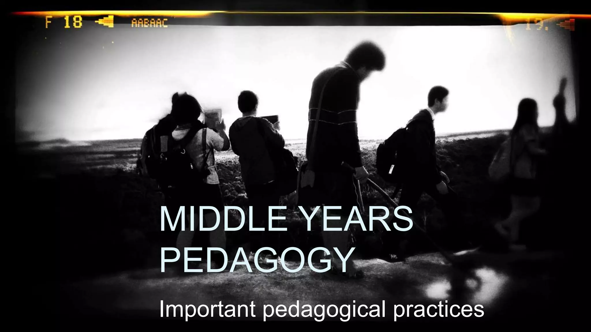 This document outlines important pedagogical practices for middle years education, including the use of higher order thinking strategies, integrated and interdisciplinary curricula, heterogeneous and flexible student grouping, cooperative learning, small learning communities, strong teacher-student relationships, authentic and reflective assessment with high expectations, democratic leadership and governance, and parental and community involvement. The pedagogical practices are outlined in a reference from Pendergast and Bahr's 2010 work on teaching middle years.