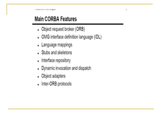 The document discusses middleware technologies, providing an overview of middleware categories and services. It describes middleware as software that connects diverse computer systems and formats. The main categories of middleware services discussed are data management, communication, distribution, object management, application cooperation, presentation, and system management services. Examples of specific middleware technologies like CORBA, COM/DCOM, and TAPI are also summarized. The document outlines some advantages of middleware like enabling real-time access and streamlining processes, as well as disadvantages such as high costs and immature products.
