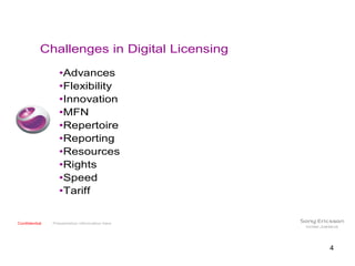 This document summarizes a presentation on digital licensing in the music industry. It discusses how technological revolutions like the printing press, recordings, films, radio and CDs have enhanced resources and revenues for the music industry over time. It notes that the current digital revolution is faster-paced than previous ones. It also examines issues like rights fragmentation, distribution of collected royalties, and the future role of music publishers in licensing digital rights and collecting streaming revenues. Key challenges include determining who will negotiate deals with digital services and how revenues will be distributed.