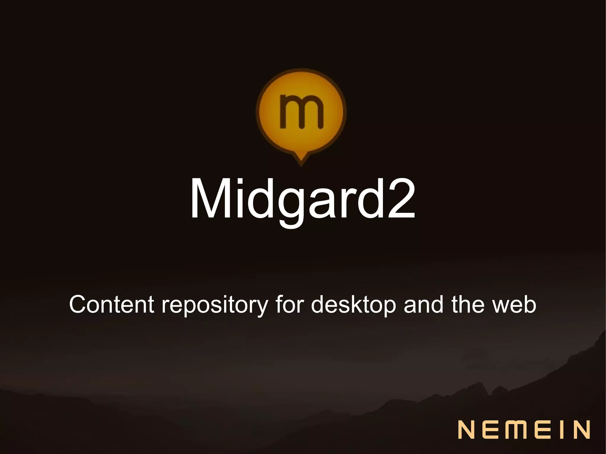 Midgard2 is a content repository that provides common rules for data access and signals about changes. It uses objects instead of SQL for a more flexible data model that is scriptable. Midgard2 provides a generic content storage based on ontologies, with object-relational mapping and a query builder. It is usable as a library in multiple languages and supports synchronization, sharing, and interprocess communication through D-Bus signals.