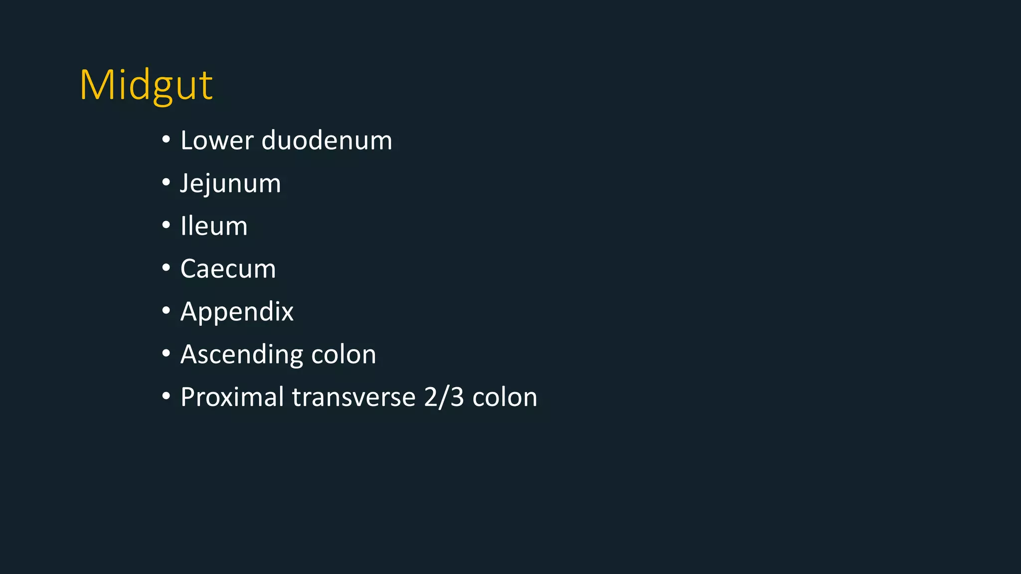 1. The midgut forms a U-shaped loop that herniates through the umbilical ring and undergoes two rotations to return to the abdominal cavity, positioning the appendix on the right.