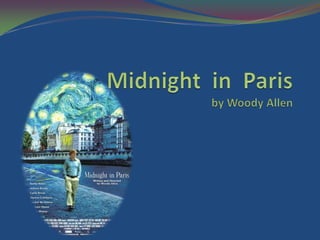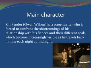 Gil Pender is a screenwriter who is unhappy with his relationship and life in modern Paris. Each night at midnight, he travels back in time to the 1920s where he meets famous historical figures like Ernest Hemingway and Gertrude Stein. He falls in love with a woman from the 1920s, which causes him to question if he belongs in the past rather than his own time. The audience understands Gil's desire to stay in the past because they see how well he fits in with the crowd from the 1920s.