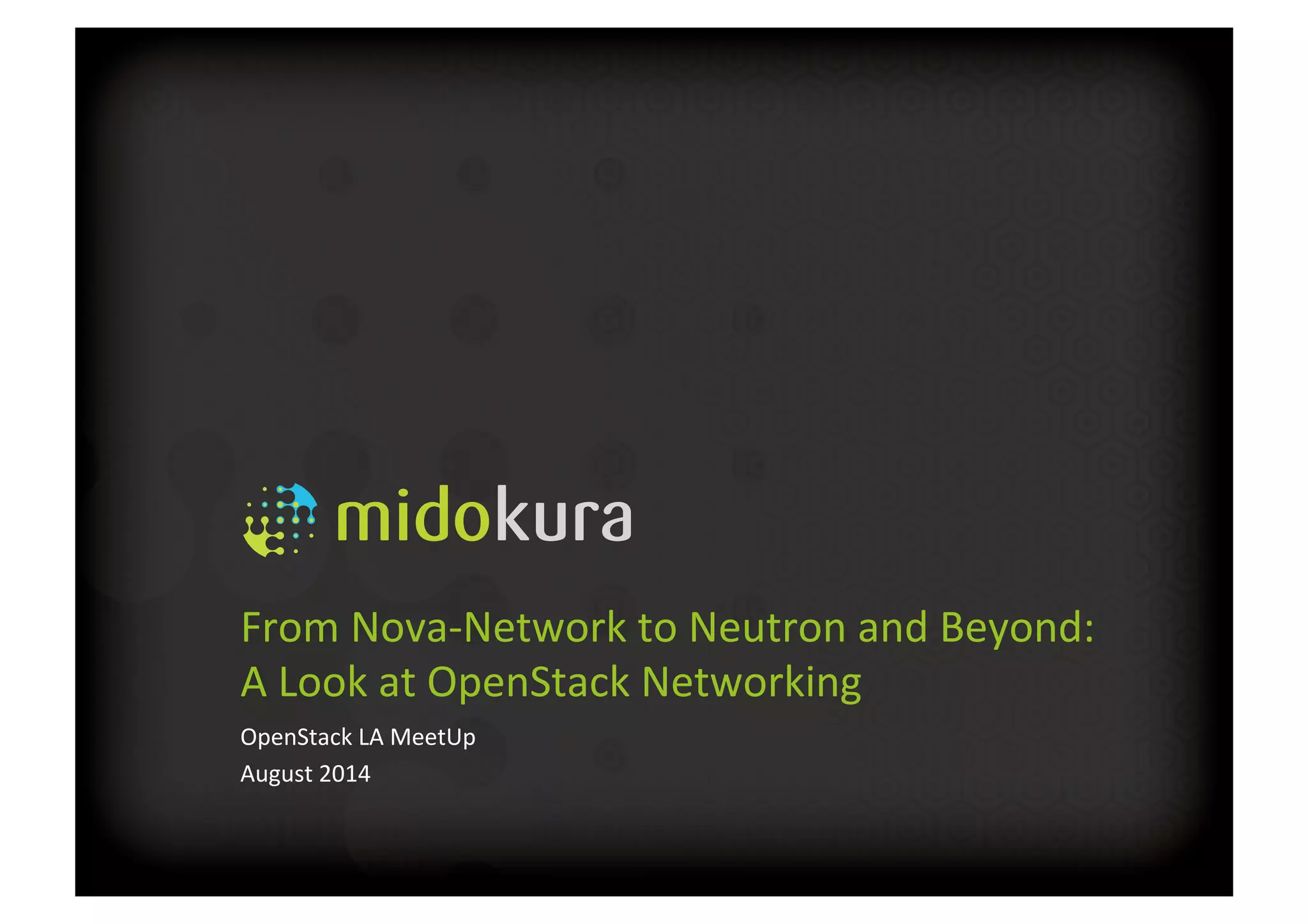 This document provides an overview of the evolution of network virtualization and OpenStack networking. It describes how networking started with manually configured VLANs, moved to OpenFlow which required programming flows, and then to network overlays using software defined networking. It outlines the requirements for network virtualization. It also details the evolution of OpenStack networking from Nova network to Quantum/Neutron, including the transition to using overlays and supporting plugins. Key features of Neutron are summarized, as well as upcoming features planned for future OpenStack releases.