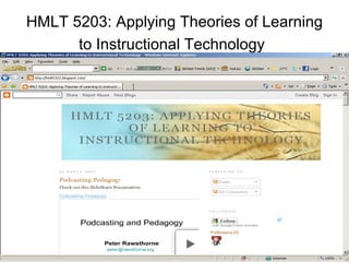 This document lists course codes and titles related to applying theories of learning to instructional technology and critiquing electronic portfolios. It includes the course HMLT 5203 on four lines and HMVS 6502 on three lines, both with matching course titles focusing on learning theories, instructional technology, and reviewing electronic portfolios.