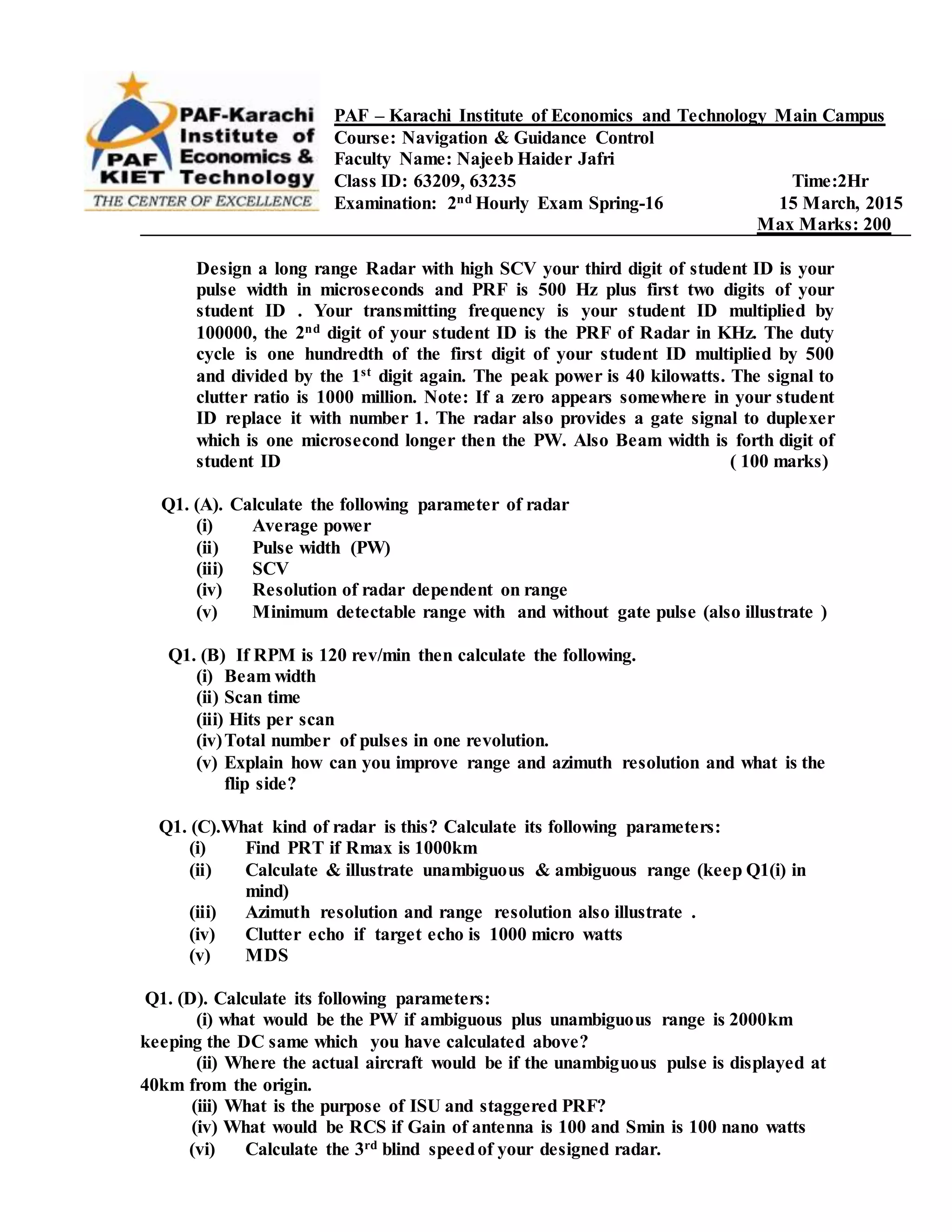 This document contains instructions and questions for a navigation and guidance control exam. It asks students to design a long range radar system based on their student ID number and calculate various radar parameters. It then provides multiple choice questions about radar systems, control systems, aircraft navigation and landing systems. It contains diagrams and asks students to identify systems, explain control mechanisms, and propose emergency procedures to safely land an aircraft experiencing multiple failures.