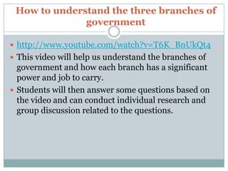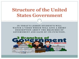 The document provides an overview of a lesson on the structure of the United States government. Students will watch a video explaining the three branches of government and their functions, then answer questions about the branches' powers. Specifically, the legislative branch makes laws, the executive branch enforces laws, and the judicial branch interprets laws. Students are asked questions to help them understand the division of powers between the federal and state governments.