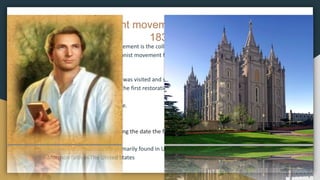 1) Mormonism, founded by Joseph Smith in 1830, which believes Smith was visited by Christ and restored true Christianity. They celebrate Pioneer Day on July 24th marking the arrival of Mormons in Salt Lake Valley.