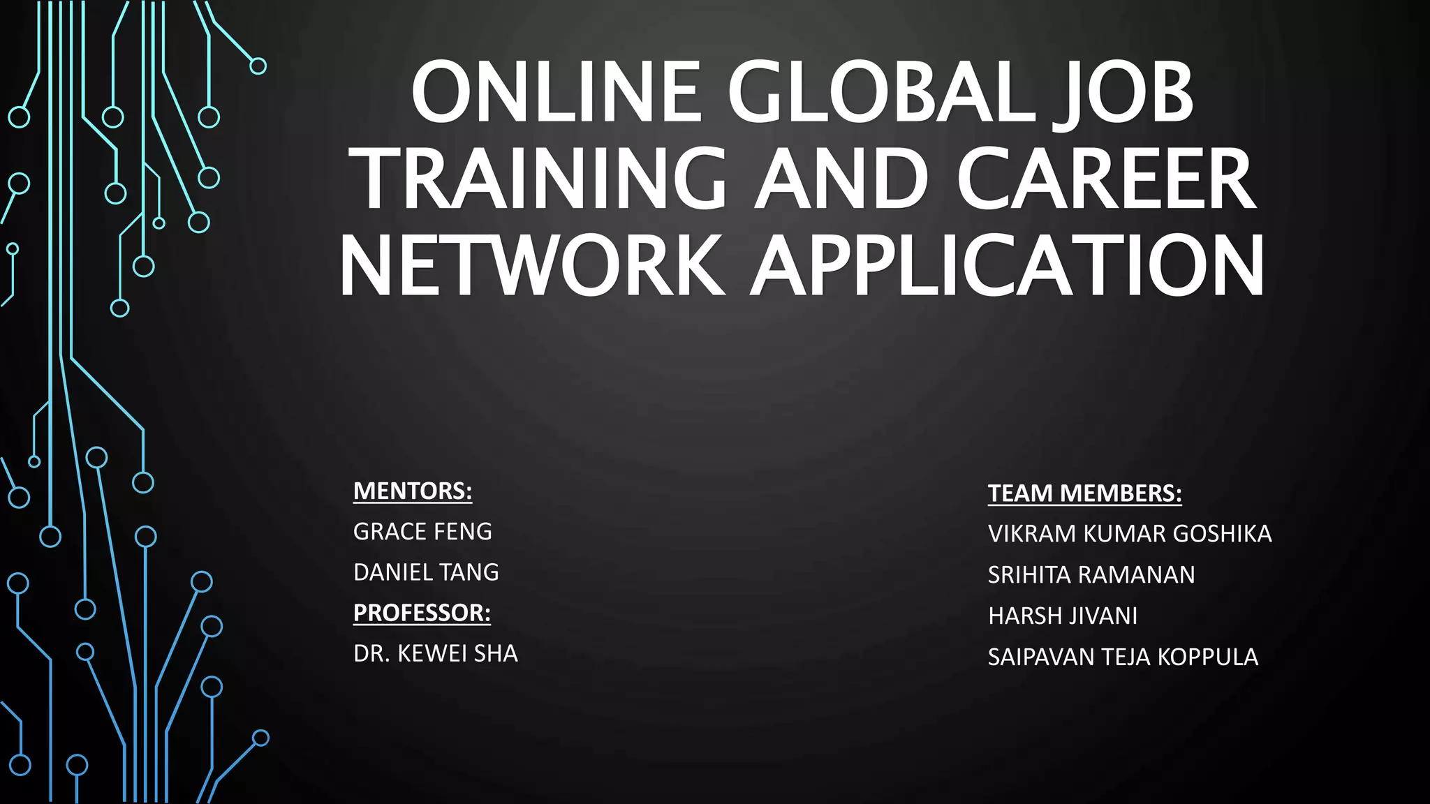 This document outlines an online global job training and career network application created by a team of students. It includes an introduction to the project, the system architecture, tools and technologies used, modules of the application including main admin, company, training center, support center, and investor, security measures, milestones, and roles and responsibilities of team members. The overall purpose is to create a web application that connects companies, training schools, and a support center and allows users to view statistics, generate reports, and securely access and modify database information.