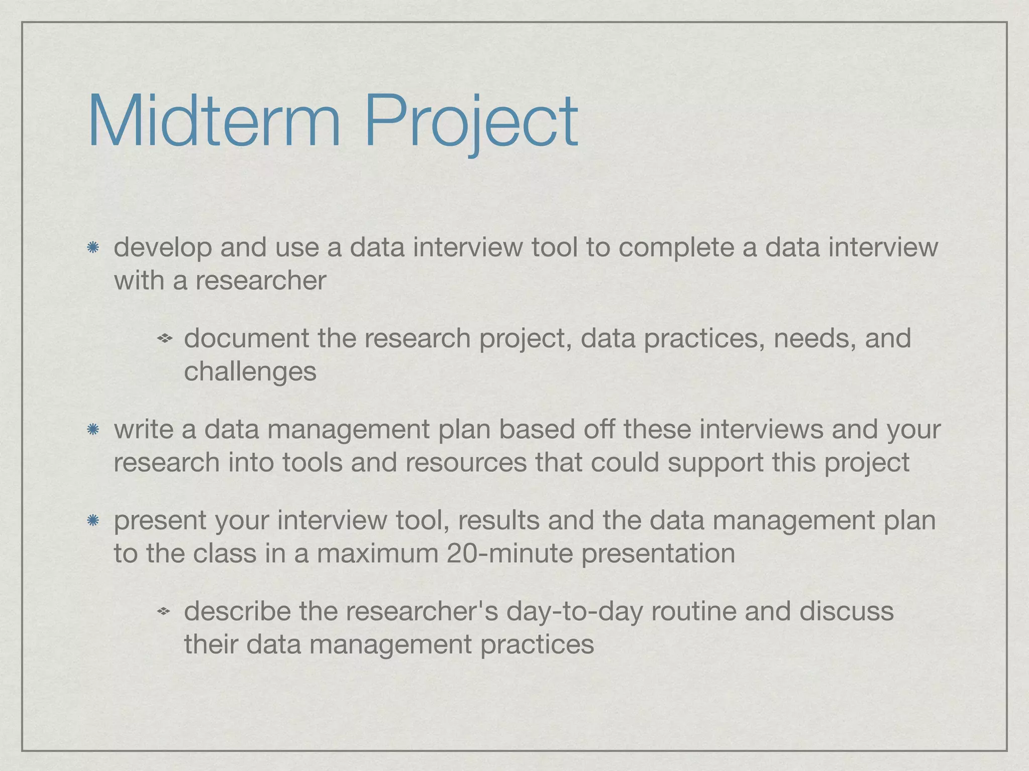 The document outlines a midterm project aimed at developing and utilizing a data interview tool to gather essential information from a researcher for constructing a data management plan. It details the interview process, key topics to discuss regarding the researcher's data practices, and provides guidance on presenting findings and managing research data throughout its life cycle. Additionally, it includes example questions and resources for preparing the interview and crafting the data management plan.