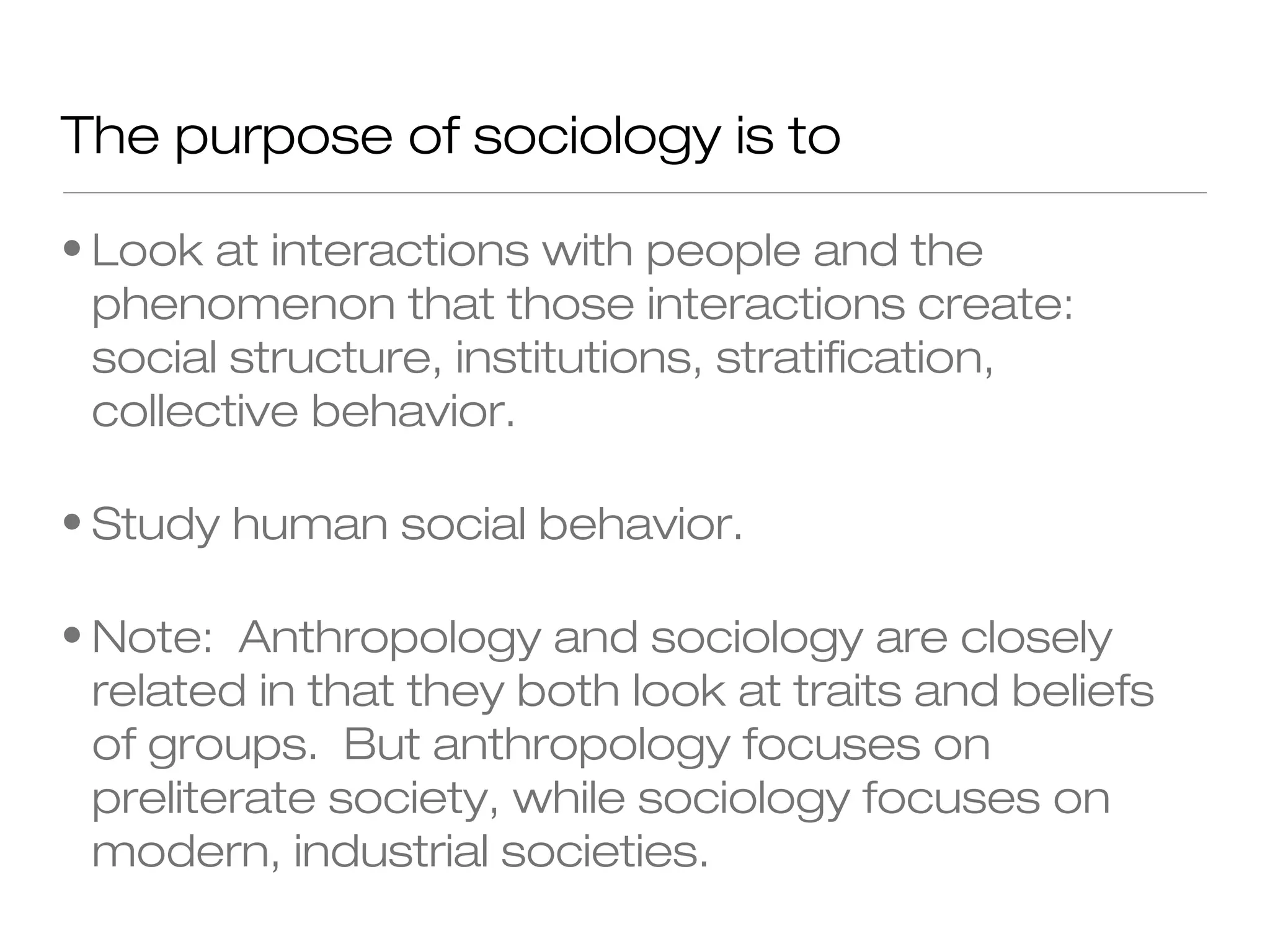 The purpose of sociology is to study human social behavior and the phenomena that interactions between people create, such as social structures, institutions, stratification, and collective behavior. It focuses on modern industrial societies, whereas anthropology focuses on preliterate societies. The sociological imagination allows people to see connections between personal experiences and larger social forces or trends. Early founders of sociology included Auguste Comte, Harriet Martineau, Herbert Spencer, Karl Marx, Emile Durkheim, Max Weber, Jane Addams, and W.E.B. Du Bois. Sociologists use theoretical perspectives like functionalism, conflict theory, and symbolic interactionism to study and understand social phenomena. Common research methods include surveys,