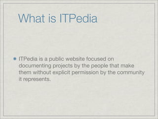 ITPedia is a public wiki focused on documenting projects without permission from those it represents. It aims to persuade people to use the wiki through free-form collaboration rather than structured taxonomies. The wiki answers questions about people's projects and relevant gear through an iterative ontology and existing data sources.