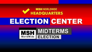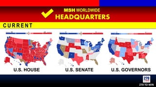 The document discusses midterm election projections from MSH Worldwide Headquarters. It predicts that Democrats will keep control of the U.S. House of Representatives with Nancy Pelosi remaining as minority leader. For the U.S. Senate, it projects that Republicans will maintain control. Additionally, Republicans are projected to maintain their majority among U.S. governors. It lists some important races to watch for each of these divisions of government.