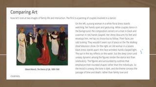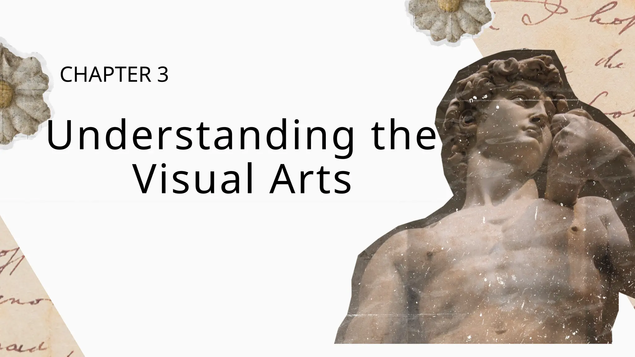 Chapter 3 focuses on understanding and evaluating visual arts, emphasizing the differences between representational, abstract, and non-objective art forms. It explains that representational art depicts real objects, while abstract art transforms those subjects in new ways, and non-objective art exists purely for aesthetic purposes without representing reality. The chapter also highlights the importance of themes, mood, tone, and composition in understanding visual artwork.