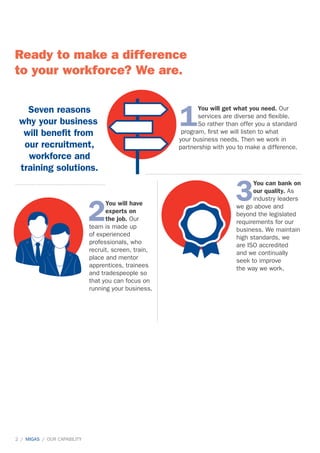 MIGAS is an Australian workforce solutions provider that has been operating for almost 30 years. They recruit, screen, train, place, and mentor apprentices, trainees, and tradespeople for client companies. MIGAS aims to take on responsibilities like paperwork, training arrangements, and performance assessments so clients can focus on running their business. They maintain high quality standards, ISO accreditation, and aim to continually improve their services. MIGAS works flexibly with each client to understand their specific needs and provide customized workforce solutions.