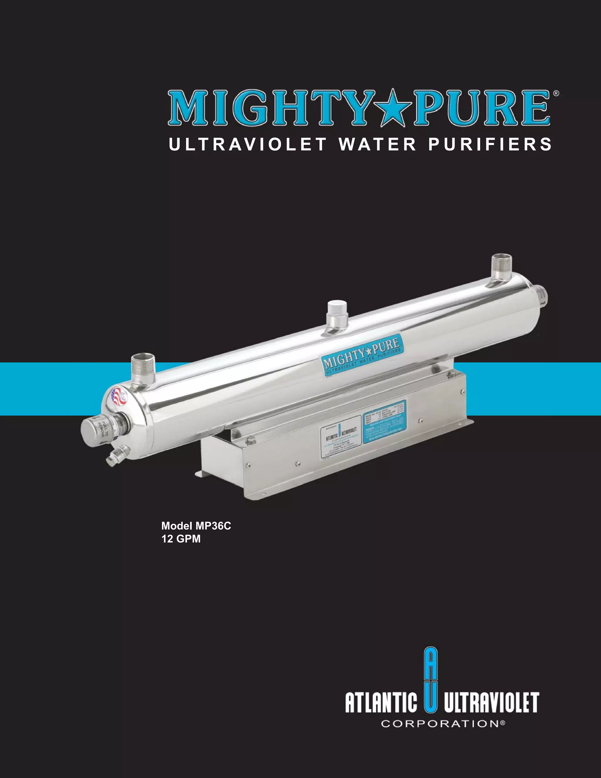 This document provides information about various ultraviolet water purifier models from Atlantic Ultraviolet Corporation. It summarizes the key details of four standard models - the MP16A, MP22A, MP36C, and MP49C. The MP36C is highlighted and described as having a flow rate of 12 gallons per minute, operating on a 120V power supply, and dimensions of 36.5 inches long, 5 11/16 inches wide, and 9.5 inches high. Optional accessories that can be used to monitor the purifier systems are also outlined.