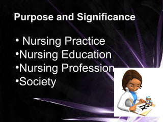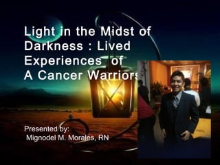 This document summarizes a research study about the lived experiences of cancer patients. It discusses the purpose and significance of studying this topic for nursing practice, education, and the profession. The study used qualitative phenomenology methodology to interview 8 cancer patients about their perceptions and coping mechanisms. Key findings included feelings of fear, pain, family impacts like financial burden, and personal changes. Patients found motivation to continue treatment through faith, family support, and dreams of recovery. The summary recommends that nursing practice be sensitive to patients, education incorporate these findings, and the profession strengthen oncology specialization and partnerships.