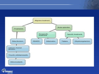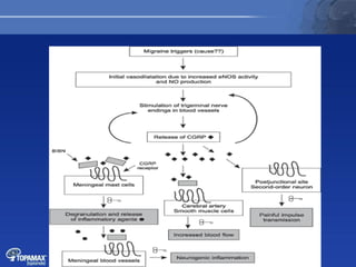 The document discusses the pathophysiology of migraines. It outlines three main theories: [1] the vascular theory which attributes migraines to vasodilation, [2] the neurogenic theory which points to neuronal events like cortical spreading depression, and [3] a combined neurovascular theory. Newer research highlights the role of CGRP, which is involved in trigeminal pain processing and vasodilation. CGRP antagonists and monoclonal antibodies show promise as preventive migraine treatments.