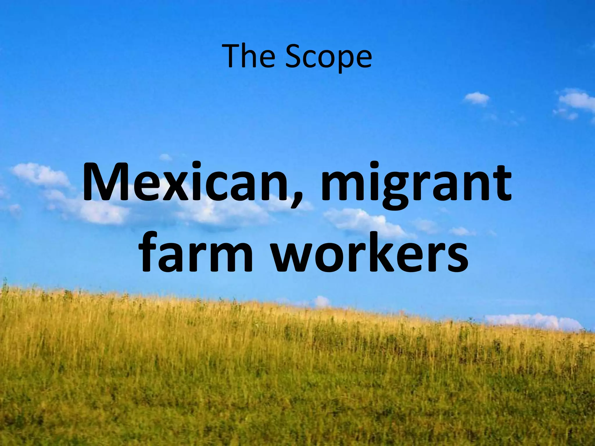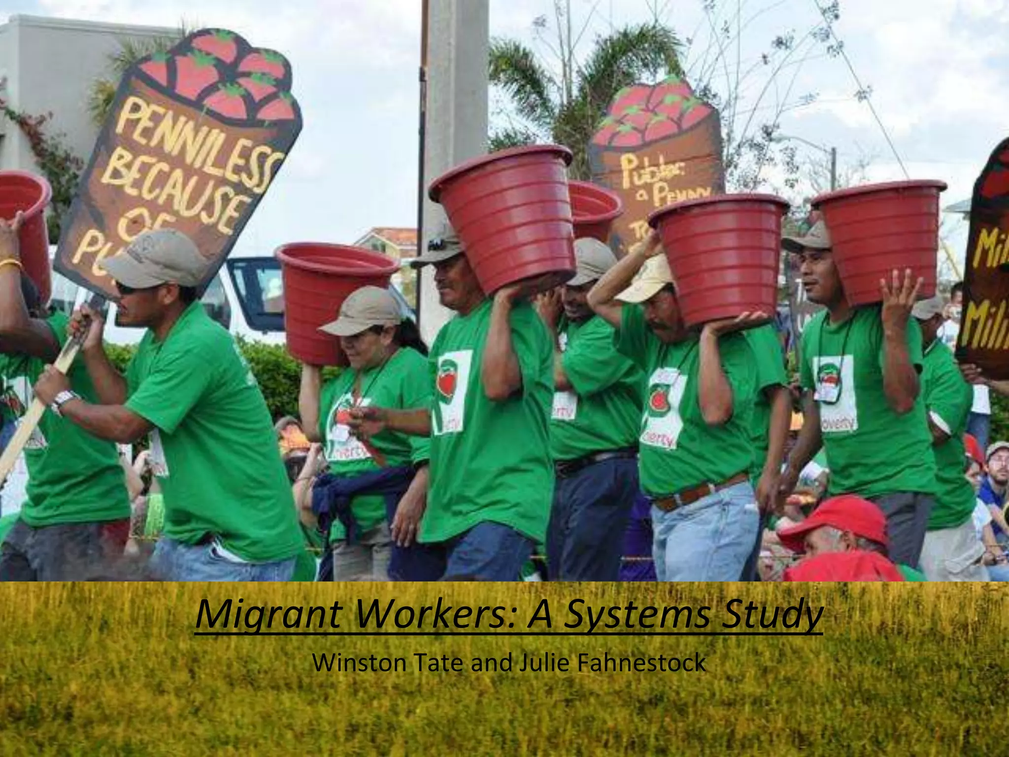 The document discusses the history and current state of migrant farm workers in the United States. It begins with the Bracero Program from 1942-1964 that allowed over 4 million Mexican guest workers due to agricultural labor shortages. Today, almost three-fourths of US farm workers are immigrants that the food system depends on. The system that employs migrant workers is maintained through coercion, violence, and deceit. Various stakeholders, including politicians, the public, corporations, and farmers, view the issue differently and perpetuate the system.