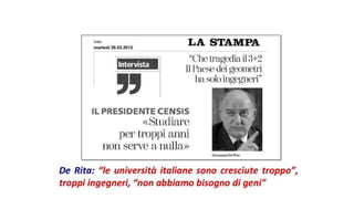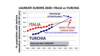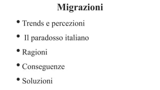 Il documento discute le problematiche legate alle migrazioni in Italia, evidenziando il paradosso tra la presenza di un alto numero di migranti e la difficoltà del paese a integrare queste risorse. Inoltre, si analizzano le carenze nell'investimento in ricerca e sviluppo e nell'istruzione, con particolare attenzione alla competitività e alla produttività economica dell'Italia rispetto ad altre nazioni europee. Viene sottolineata l'importanza di soluzioni a lungo termine per affrontare queste sfide, evitando le misure di austerità che aggravano la situazione.