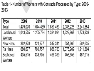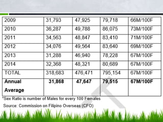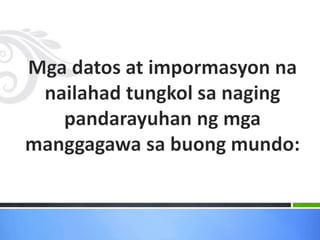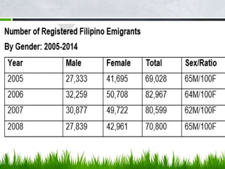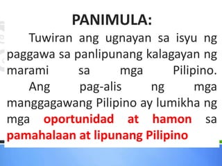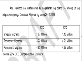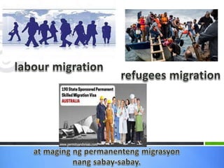 Ang dokumento ay tumatalakay sa migrasyon ng mga Pilipino, na naglalaman ng mga dahilan at uri ng migrasyon, kabilang ang panloob at panlabas na paglipat. Ipinapakita nito ang epekto ng migrasyon sa ekonomiya, ang pagtaas ng bilang ng mga imigrante, at ang mga hamon na kinakaharap nila, tulad ng panganib ng pang-aabuso at hindi pagkakaroon ng tamang benepisyo. Ang migrasyon ay isinasalamin bilang isang komplikadong isyu sa lipunan na may implikasyong pang-ekonomiya at pampolitikal.