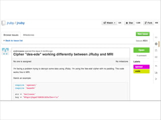 This document summarizes the lessons learned from migrating a Ruby on Rails codebase to JRuby. Some key points covered include choosing a deployment strategy like Warbler or TorqueBox, addressing issues with forking and signals in JRuby, using thread-safe patterns to avoid sharing mutable state between threads, and alternatives to C extensions and OpenSSL in JRuby. Tuning aspects like connection pools, thread pools, and JVM memory are also discussed.