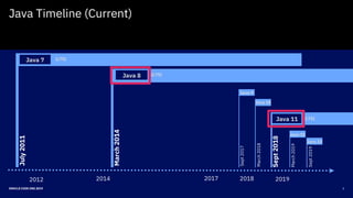 This document discusses migrating applications from Java 8 to later versions of Java such as Java 11 and Java 12. It outlines changes in the Java timeline including features added in versions 9 through 13. Major changes include modules, removed packages and methods, and behavior changes. The document recommends using scanning tools to analyze applications for migration issues and references additional resources on the Java migration.