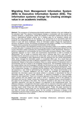 1) The document discusses migrating an academic institute's information system from a management information system (MIS) to an executive information system (EIS) to create strategic value.