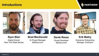 The document outlines the migration process of the New York State Senate's website to the Pantheon platform, detailing the planning, execution, and technical challenges encountered. Key tasks included setting up a new production database, migrating code and content, and ensuring the performance of custom features like Solr search. The ultimate goal is to advance tools for participatory governance, culminating in a fully open architecture version of the site by leveraging collaborative development tools.