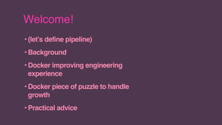 This document discusses Spotify's migration of data pipelines to Docker. It provides background on Spotify growing from 50 to 1000 engineers and the challenges of scaling their big data infrastructure. Spotify adopted Docker to help solve packaging and dependency issues, moving pipelines from cron jobs to a REST API and Docker images. Docker is allowing Spotify to transparently migrate their on-premise Hadoop cluster to Google Cloud, handling over 100 petabytes of data and growing.