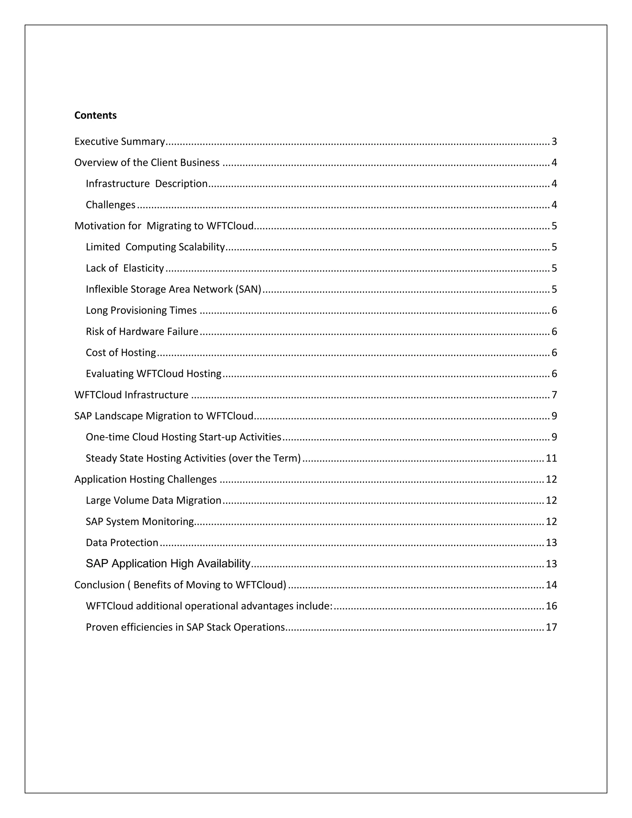 WFTCloud successfully migrated a Canadian transportation company's SAP applications from an on-premise data center to their cloud infrastructure. The migration addressed challenges with the client's legacy hosting including limited scalability, long provisioning times, and high costs. The migration involved provisioning resources on WFTCloud, migrating data, testing, and validating the new cloud-hosted SAP landscape. Once complete, the client benefitted from improved application robustness, lower monthly hosting costs, and an infrastructure providing elasticity, high availability, and on-demand provisioning.