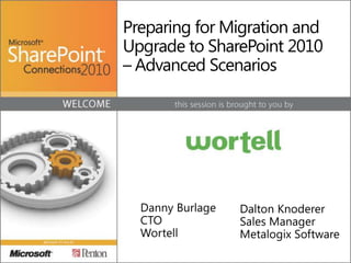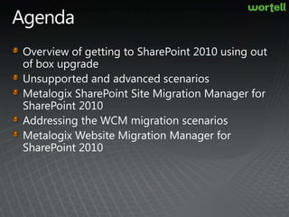 The document provides a comprehensive overview of the migration and upgrade process to SharePoint 2010, including supported and unsupported scenarios, tools available for migration, and best practices. It discusses different methods for upgrading, such as in-place upgrades, database attachments, and PowerShell cmdlets, as well as the features of Metalogix's migration products. Key highlights include the importance of meeting hardware requirements and recognizing limitations for certain versions and configurations during the migration process.