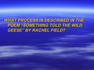 The poem describes the migration of wild geese. It conveys that an internal sense or intuition tells the geese that it is time to leave as winter approaches, despite the lingering signs of summer like green leaves and berries. The geese follow their instinct to fly south where the summer sun will be on their wings, carrying their cry of winter.