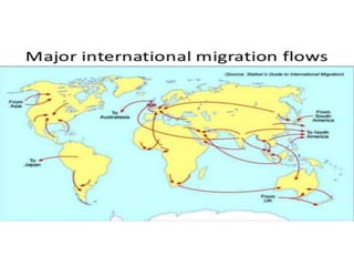 The document discusses migration, defining it as the permanent movement of people between geographical locations and categorizing it into types such as international and internal migration. It outlines various causes and impacts of migration, including socio-economic effects, trends of migration from Bangladesh, and the implications on both sending and receiving countries. Additionally, it explores migration theories such as Ravenstein's and Lee's models, highlighting push/pull factors and intervening obstacles that affect migratory patterns.