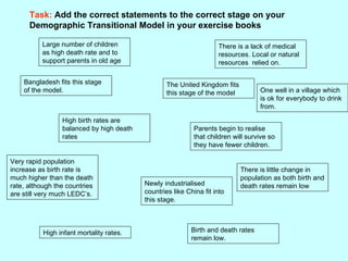 - It also addresses population growth issues in LEDCs, noting high birth rates balanced by high death rates in Stage 2 of the demographic transition model. Urbanization is increasing in LEDCs due to migration, high birth rates, and declining death rates.