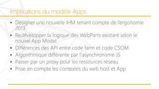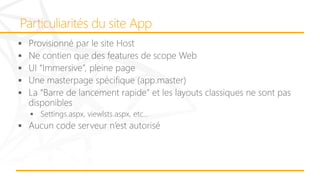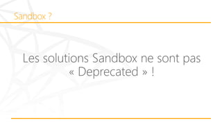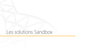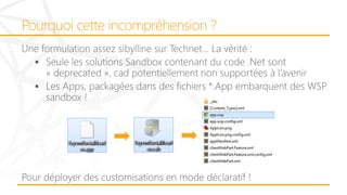 The document discusses solutions for sandboxed applications and their integration, highlighting the differences in design and the importance of isolation for security and flexibility. It covers aspects like cloud-based apps, developer-hosted apps, and the use of SharePoint with various hosting methods including Azure. Key points include the need for tenant isolation and the prohibition of server code in certain app types.