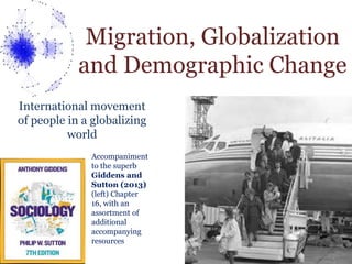 The document discusses the dynamics of migration in the context of globalization and demographic changes, highlighting that approximately 1 in 33 people globally is a migrant, with expectations for this number to rise significantly by 2050. Various migration models are explored, including historical trends and the political controversies surrounding immigration, while also addressing the exploitation of migrants and their integration into societies. The relationship between demographic transition stages and migration rates is examined, suggesting a reciprocal influence between migration patterns and demographic changes in countries of origin.