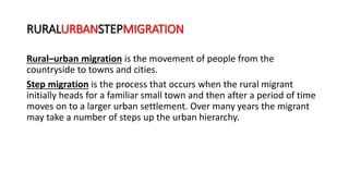 Rural-urban and peripheral-core region migration are most common, though rural-rural migration occurs in developing nations for reasons like employment, family, and marriage. Migration between urban areas involves step migration up the hierarchy as migrants' knowledge and finances increase, alongside other urban-urban moves for education and jobs. Reasons for relocation can be viewed at macro, meso, and micro scales focusing on socioeconomics, origin/destination factors, and individual circumstances, respectively.
