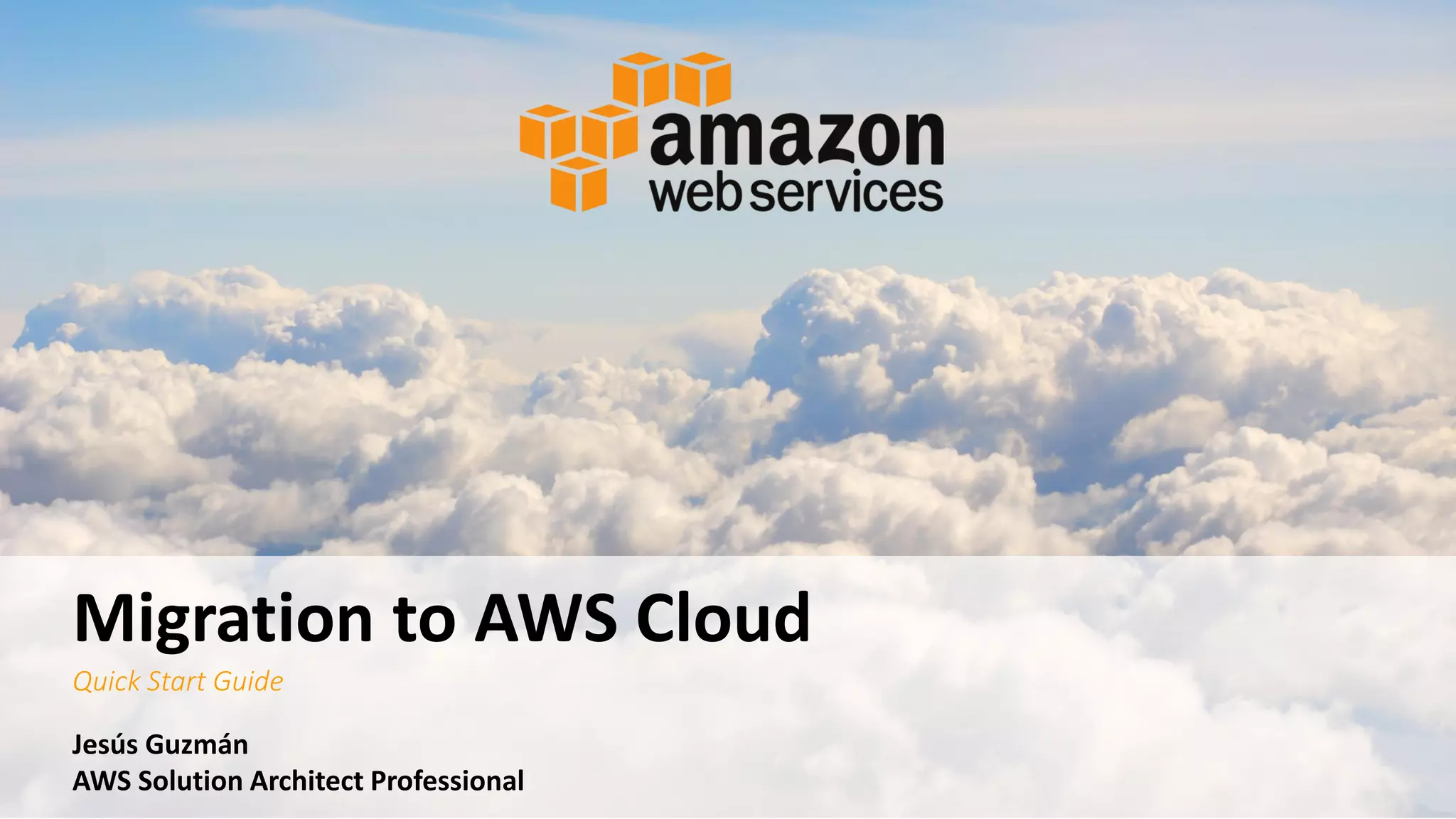 This document provides a quick start guide to migrating workloads to AWS cloud. It introduces the author Jesus Guzman and his background. It then discusses why organizations choose AWS, highlighting its global infrastructure. Common migration challenges are noted such as time, data amount, business case, planning, tools selection and more. The migration process is outlined as assessment, planning, migration, and tracking/optimization. Various AWS services that can help with each step are described, including Migration Hub, Application Discovery Service, Server Migration Service, Database Migration Service, and data migration options like S3, Snowball, and Snowmobile. The document recommends evaluating your organization's readiness and provides links to AWS professional services that can assist with migration.